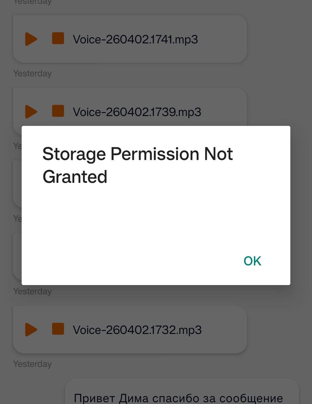 3. When we try to download MPr files from the chat on your updated version of the app it does not allow us as we have mentioned to you earlier but it has not been fixed, so downlaoding files from the app still has not been fixed. Wehn we attempt to donlaod a file the Storage Persishin Not Granted message comes up instead. https://webmaklay.com/wp-content/uploads/2026/04/downloadmp3.jpg