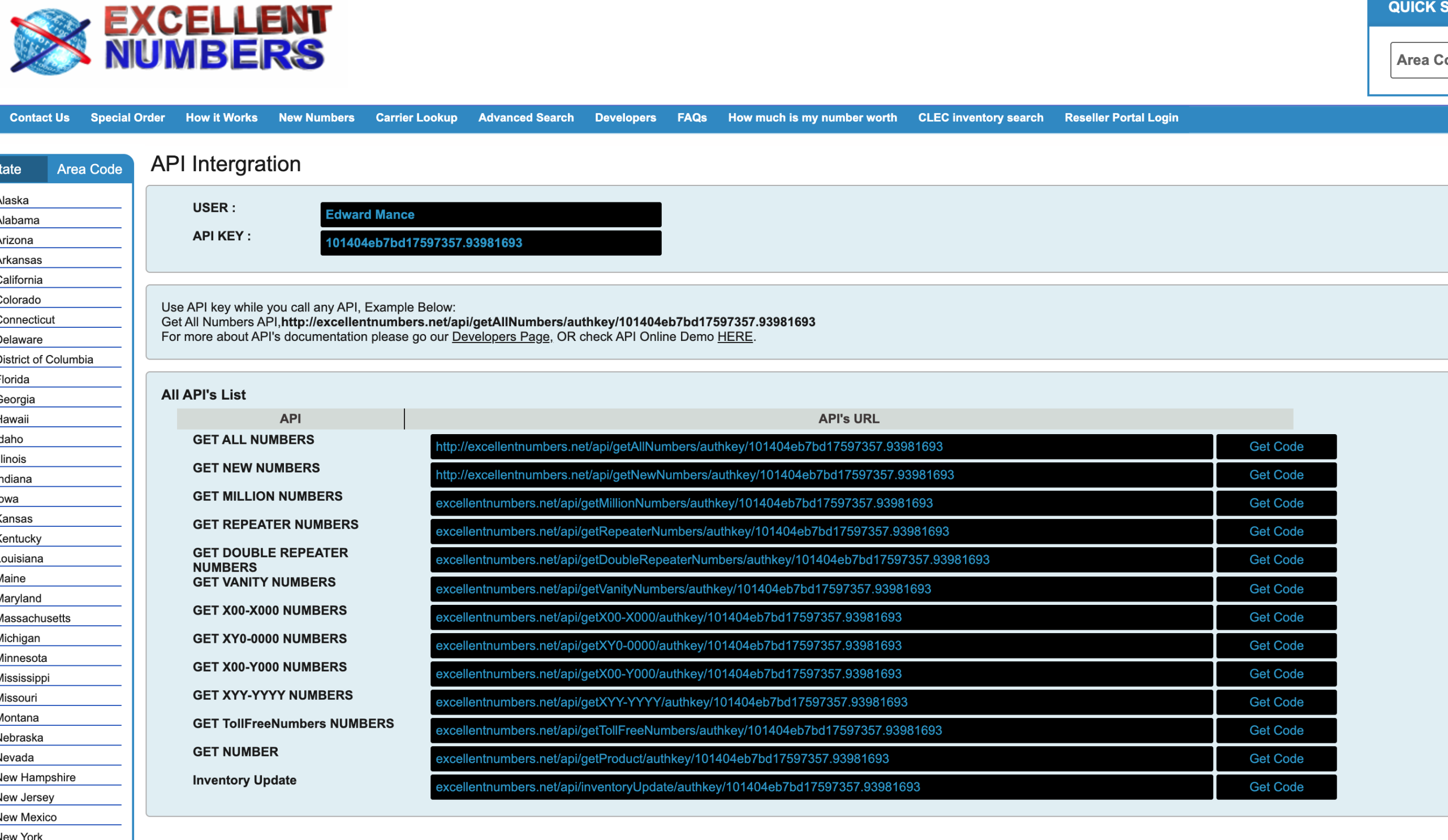 The API url: http://excellentnumbers.net/api/getAllNumbers/authkey/101404eb7bd17597357.93981693Also, following API urls do not work at all.