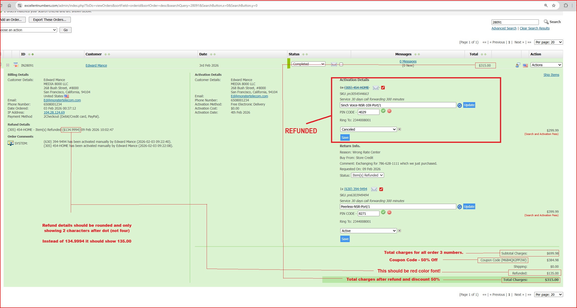 The refund sum is also 135 $ (screen shot aslo attached).Issue the total charges 699.98 – 50% = 315$ and if you can see on the screen shot customer paid 315 this is correct BUT it did not caclulated refund so total charges after discount shoould aslo incude refund but in thic case it has not caclulated refund but only 50% discound coupon code.