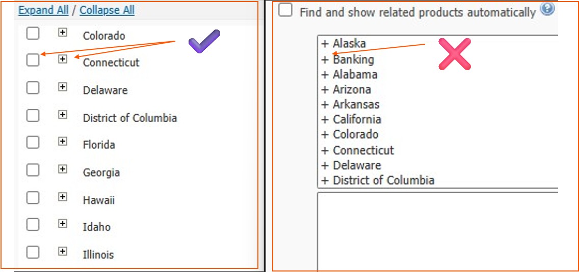 On the image attached the dropdown with a tick looks correct as it was before on the EN project and on the right hand side image with cross it looks a bit ugly and it is not looking as it was on the EN site before.Would you please advice if your: “CSS enhancements to make it look cleaner and more user-friendly” already applied? We would be happy to have drop down category design same way as it is on the left hand side of the image with a purple ticked sign.